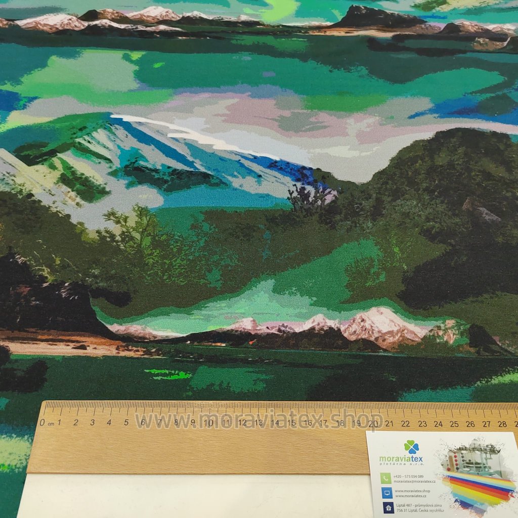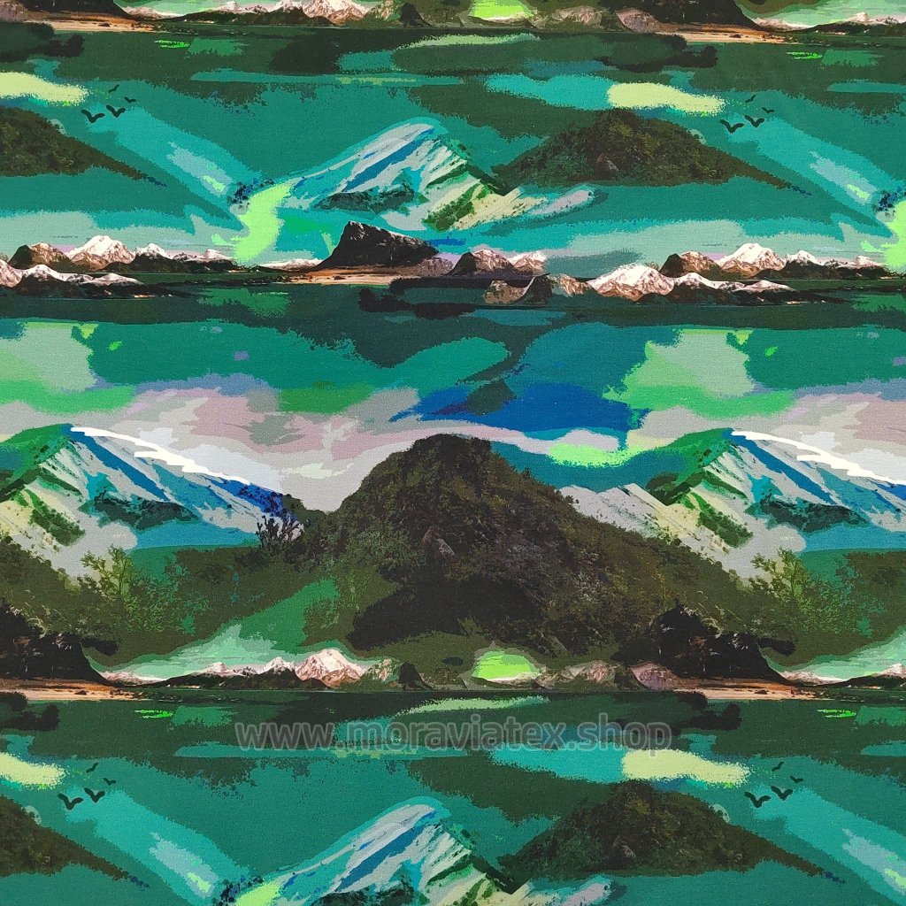 Balíček 1 metr - Jednolíc elastický Bambus/Elastan 6% digi tisk Hory (0,40kg)
