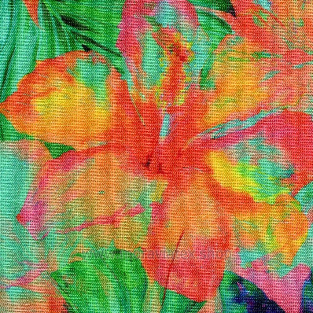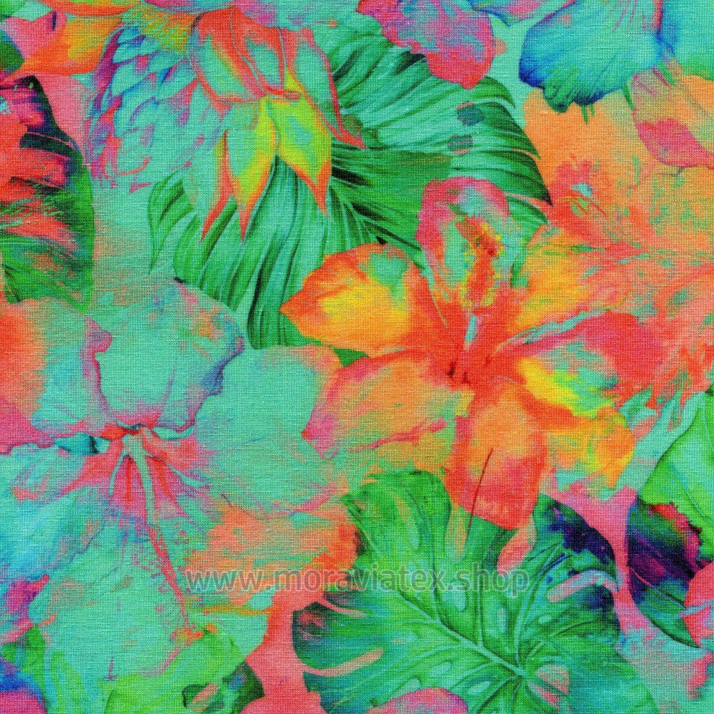 Balíček 1 metr - Jednolíc elastický Bambus Viskóza/Elastan 6% digi tisk Tropical green flowers