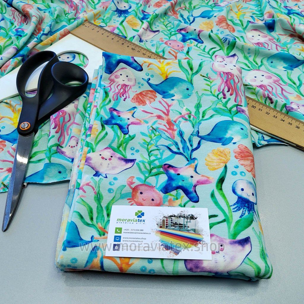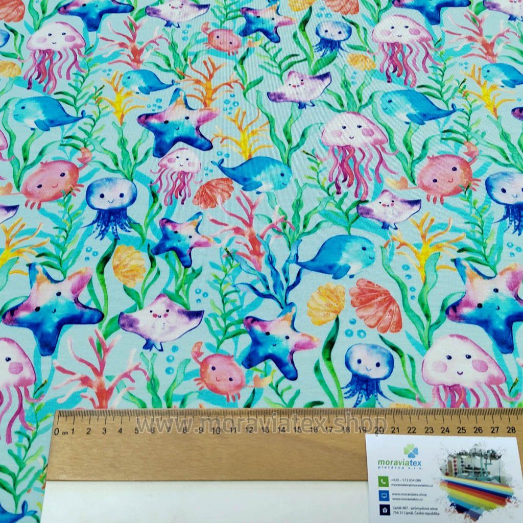 Balíček 1metr - Jednolíc elastický Bambus Viskóza/Elastan 6% digi tisk Jellyfish (0,37kg)
