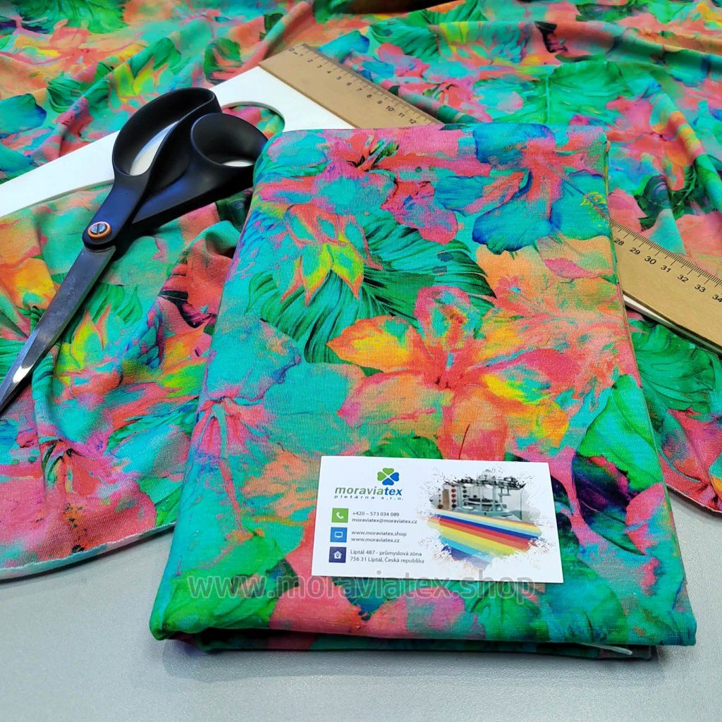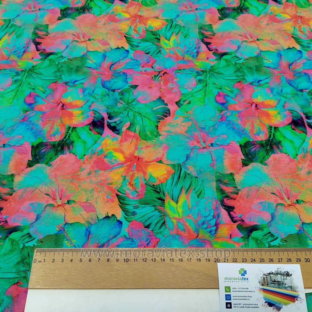 Balíček 1metr - Jednolíc elastický Bambus Viskóza/Elastan 6% digi tisk Tropical green flowers (0,37kg)