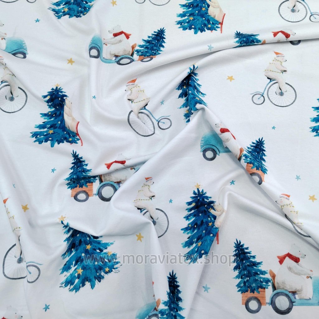 Balíček 1metr - Jednolíc elastický bavlna/Elastan6% digi tisk Medvěd se stromečkem (0,34kg)